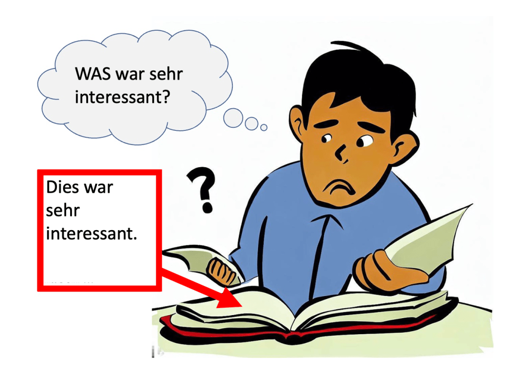 Sprache arbeitet ständig mit Bezugnahmen: Pronomen wie „dies“, „jenes“ oder „das“ verweisen auf etwas, das im Text bereits genannt wurde oder gleich genannt wird.